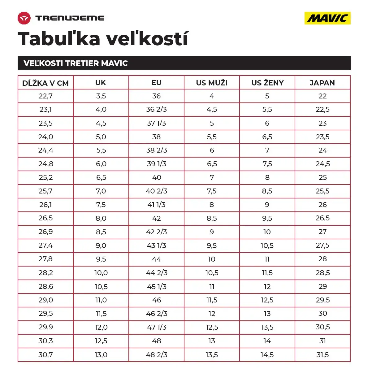 Velikostní tabulka Mavic tretry